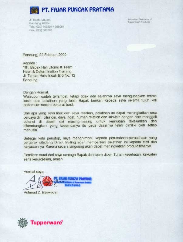 “Kami menghibau kepada Bapak (Harry Utomo) agar bentuk dan model pelatihan seperti ini dapat dipertahankan atau dikembangkan lagi, sehingga banyak yang akan mendapatkan manfaat.., karena model pelatihan yang memfokuskan diri dalam bidang Self Improvement ini sangat jarang…..” <click here>